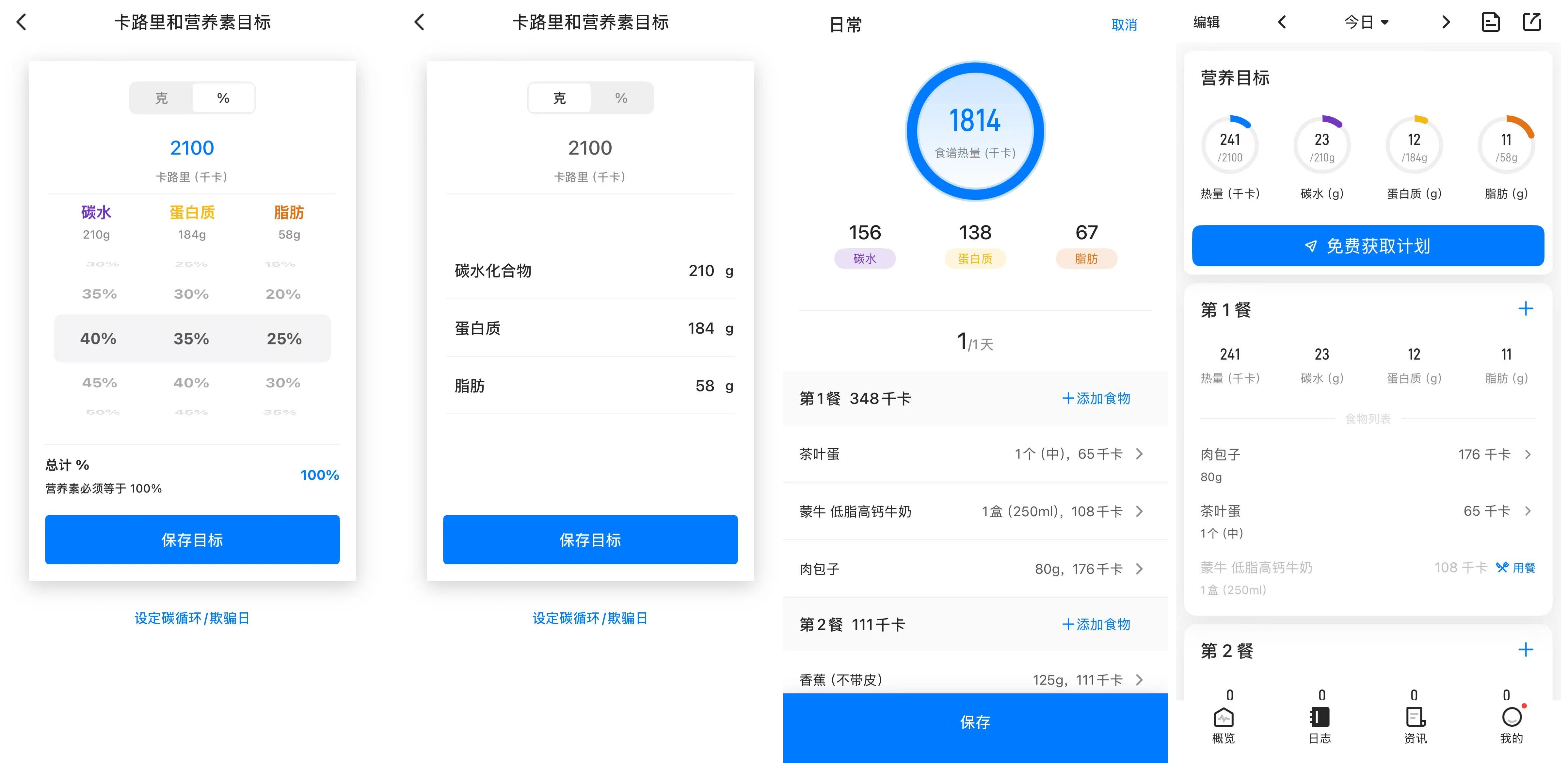 根据自身情况,我选择碳水:蛋白质:脂肪=40:35:25。然后就是制定用餐计划(慢慢调整)、当然可以灵活变换。